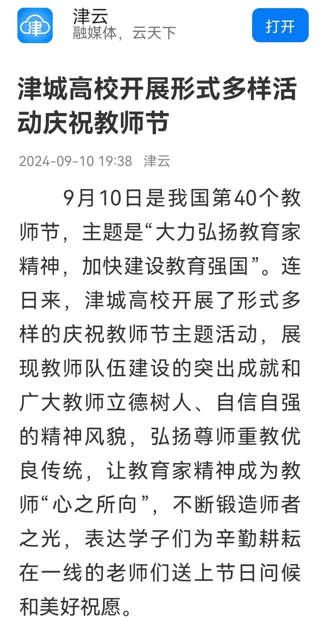 在第40个教师节来临之际,为营造尊师重教良好氛围,激励广大教师积极投身教育强国建设,我校开展了庆祝教师节系列活动。《天津日报》、津云报道我校开展教师节健康义诊等活动,护航“园丁”健康。